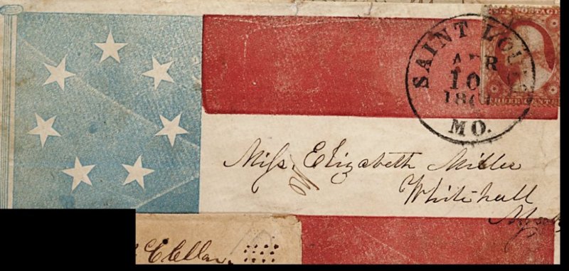 1398 c 26 image#26, 3c Dull red, with repairs, tied by bold and clean strike of a "Saint Louis Mo./Apr 10 1861" c.d.s. to a red and blue 7-Star Confederate Flag Patriotic cover, addressed to Miss Elizabeth Miller, Whitehall, New York; this is a very early use for this flag patriotic, dated April 10th which is only two days before the bombardment of Ft. Sumter began, couple of tiny edge tears at top, back has been replaced, extremely fine appearance; a scarce early Missouri usage. (Image) Est. 750-1,000