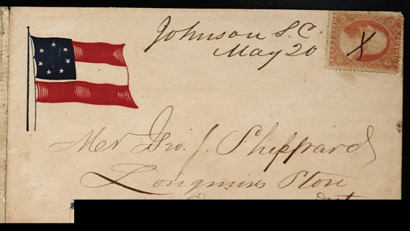 1400 c 26 imageJohnson S.C. / May 20 (1861) manuscript postmark to left of a 3c Dull red (#26), cancelled by pen stroke, rubbed at upper corner, on a very clean red and blue 7-Star Confederate Flag Patriotic cover, addressed to Geo. J. Sheppard, Longmires Store, Edgefield Dist. S.C., very fine and fresh; a scarce small town usage; ex-Kohn. (Image) Est. 750-1,000