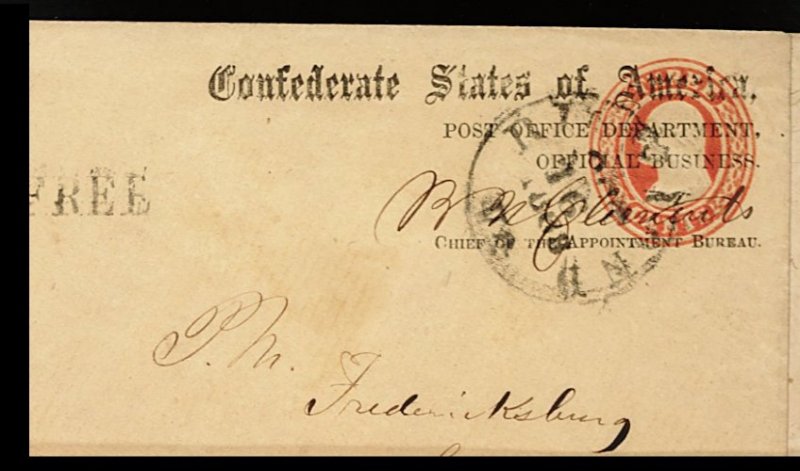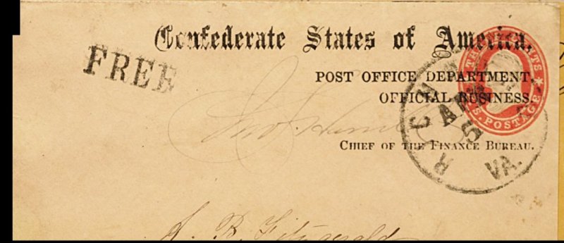 1442 c imagePost Office Department, Official Business, Chief of the Appointment Bureau, Dietz Ty. II with B.N. Clements signature, "Richmond Va./Oct 16 1863" c.d.s. on 3c Red Nesbitt entire, matching "FREE" handstamp to left, addressed to the postmaster at Fredericksburg, Va., small corner repair upper left, still very fine and fresh. (Image) Est. 200-300