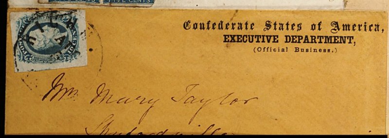 1444 c 11 image#11, 10c Blue, Die A, with enormous to large margins, showing portion of adjoining stamp at left, vibrant color and crisp impression, tied by "Richmond Va/Aug 5" c.d.s. to orange cover with Executive Department, Official Business Dietz Ty III variety imprint, this particular imprint having a "," after Department, addressed to Mrs. Mary Taylor, Shufordville (now Fletcher), North Carolina, tiny neatly sealed tear at top, tears to flap at back, still very fine and extremely fresh; an attractive cover to a tiny community in the Blue Ridge mountains of far western North Carolina. (Image) Est. 300-400