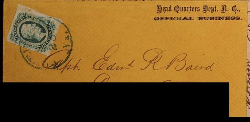 1445 c 12e image#12e, 10c Green, Die B, large to enormous margins, tied by blue "Petersburg Va./Aug 23" c.d.s. to orange Head Quarters Dept. N.C., Official Business semi-official imprint cover, addressed to Capt. Edward R. Baird, Lloyds P.O., Essex Co., Virginia, accompanied by interesting 1955 C.S.A. article concerning cover and Captain Baird, a Gettysburg survivor, extremely fine and choice; a fresh and desirable usage. (Image) Est. 300-400