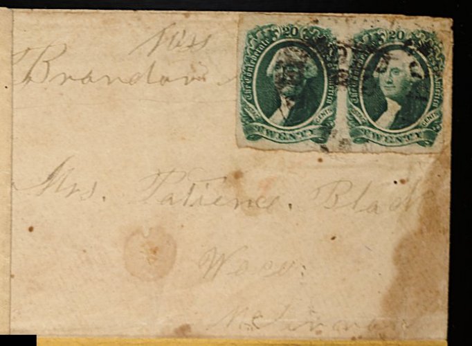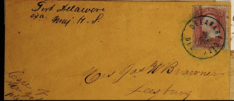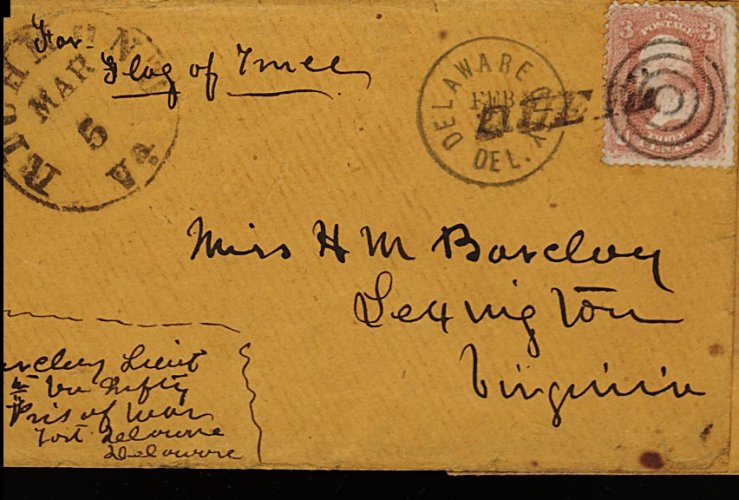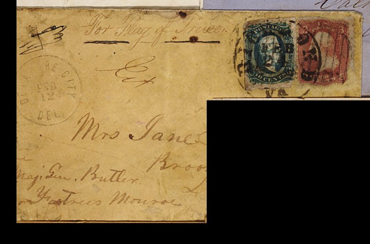 1455 11 imageFort Delaware, 10c Blue, Die A (#11) and U.S. 3c Rose (#65) both with faults and erosion at the lower margins, tied by enclosed grid handstamps and "Richmond Va./Feb 24" c.d.s. to yellow cover addressed to Brookhaven, Mississippi, "Delaware City Del./Feb 12" c.d.s. at left with manuscript routing instructions "for Flag of Truce" and "Care Maj. Gen. Butler, Fortress Monroe"; letters from Federal prisons were usually cancelled with the postmark of the nearest town, if "crossing the lines", a 10c Confederate stamp was attached or it was handstamped "Due 10" and usually postmarked at Richmond, Va., which was the largest city near City Point, the point of entry into Confederate territory; general soiling, still a very fine example of a mixed-franking cover. (Image) Est. 500-750