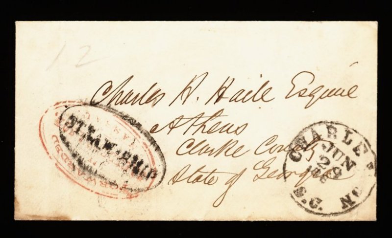 1448 c imageMontreal to Georgia via Bahamas, red "Forwarded by Saunders & Sons, Nassau." handling oval handstamp and "STEAM-SHIP" oval at left, pencil "12" rate (10c plus 2c ship fee) on lovely petite cover from Montreal, Quebec, Canada addressed to Charles Haile, Athens, Clarke County, State of Georgia, bold "Charleston S.C./Jun 29 186(3)" transit c.d.s. at lower right, interesting original enclosure accompanies, dated May 1, 1863 on Canadian Post Office Department, Dead Letter Office stationery, tiny soil spot lower left, still very fresh and extremely fine; a very scarce forwarded blockade usage into Georgia out of Canada. (Image) Est. 2,000-3,000