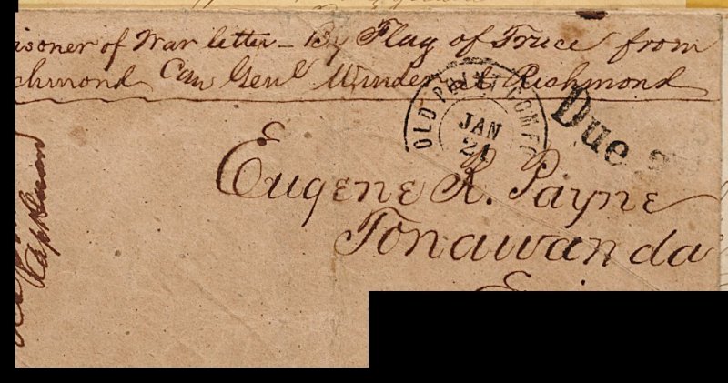 1449 c imageColumbia S.C. (Richland Jail), manuscript Confederate prison examiner's notation "Examd/R.D. Senn/Capt. Guard" left, with prisoners endorsement at top on brown homemade cover, addressed to Tonawanda, N.Y. "Care (of) Genl Winder at Richmond", "Old Point Comfort Va/Jan 21" c.d.s. and straightline "Due 3" handstamp, neatly pressed horizontal crease, still very fine. (Image) Est. 500-750