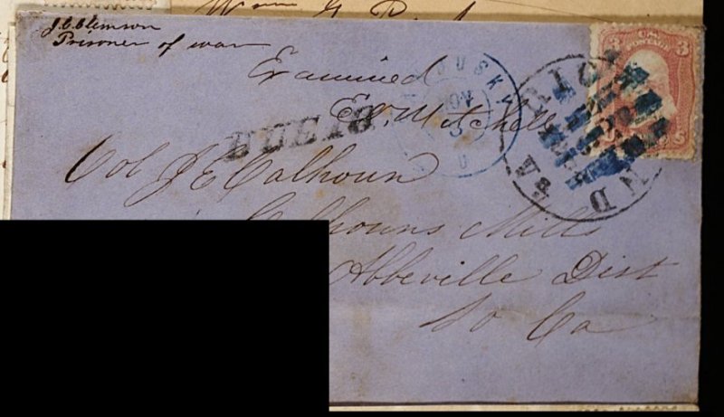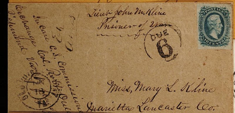 1458 c imageJohnson's Island O., manuscript "Examined E.O. Mitchell" on homemade blue cover/lettersheet addressed to Calhoun's Mills, S.C., flag of truce and soldier's prisoner of war endorsements, 3c Rose (#65) tied by striking blue segmented cork cancel with matching "Sandusky O/Nov 3" c.d.s., "Richmond Va./Nov 16 1863" transit c.d.s. also ties stamp, straightline "Due 10" at left, very unusual contemporarily glued partial envelope to letter sheet, with fascinating contents where the prisoner discusses his evasion of Federal troops, "was taken after a long & tedious journey after crossing the whole state of Miss in a mule wagon 5 miles from the Miss River by a lot of Yankees", the prison layout and treatment, some sensible fold reinforcement, very fine for this; an extremely attractive and unusual cover than gives great insight into camp layout and prisoner treatment at Johnson's Island. (Image) Est. 400-500