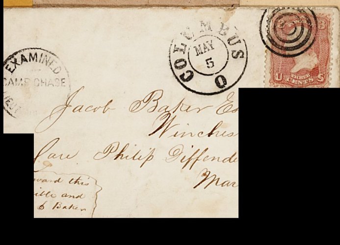 1451 c imageColumbus O. (Camp Chase), two covers both with circular "Examined/Camp Chase O" examiner's handstamps, 3c Rose (#65) tied by 4-ring target cancels and matching "Columbus O" c.d.s., one addressed to Martinsburg, Va, the other to Thomas Run P.O., Maryland, each with trivial side reduction, very fine. (Image) Est. 200-300