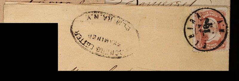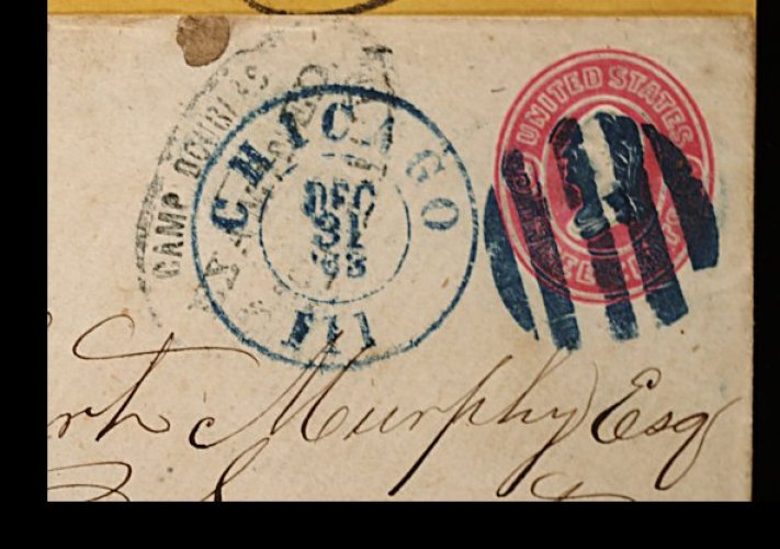 1452 c imageChicago Ill. (Camp Douglas), oval examiner's handstamp on cover to Somerset, Kentucky, with blue segmented cork cancel and matching "Chicago Ill./Dec 31 1863" c.d.s. on 3c Pink entire, dated Georgia prisoner's pass signed by Abel E. Leavenworth accompanies, slight reduction left, very fine. (Image) Est. 150-200