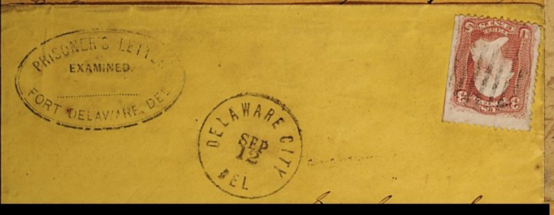 1456 c imageFort Delaware, oval examiner's handstamp at left on very clean orange cover, 3c Rose (#65) cancelled by light grid cancel with "Delaware City Del./Sep 12 (1864)" c.d.s. to left, addressed to Sam S. May, St. Louis, Mo., original datelined prisoner's letter accompanies with an optimistic statement concerning the war in Georgia, "none of us believes the report about the fall of Atlanta - of course it is not impossible", very fine and fresh. (Image) Est. 150-200