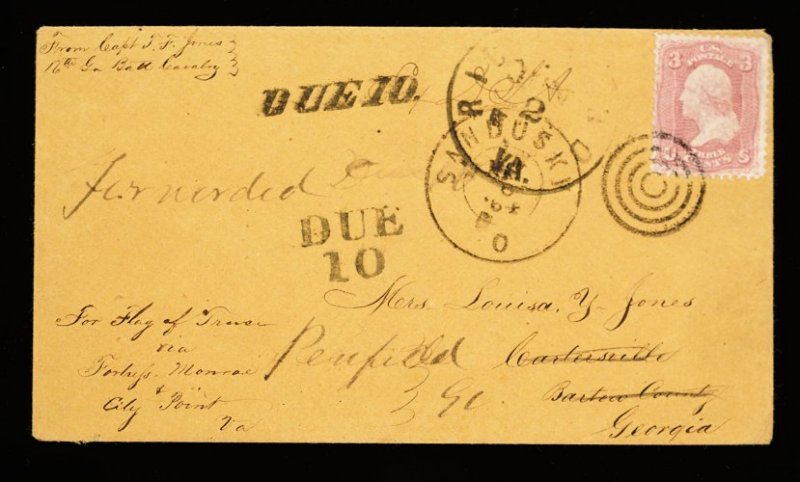1459 c imageJohnson's Island O., manuscript "Ex. D.S.A." examiner's mark on clean orange cover from prisoner, Capt. T.F. Jones, addressed to Cartersville, Georgia "For Flag of Truce via Fortress Monroe & City Point, Va.", 3c Rose (#65) tied by "Sandusky O/May 6 64" duplex target, "Richmond Va./June 2" c.d.s. transit to left with matching straightline "Due 10" handstamp, subsequently forwarded to Penfield, Ga. with manuscript "Due 10" and additional two-line "Due 10" handstamp, trivial repairs at back, very fine; an extremely fresh forwarded prisoner's cover. (Image) Est. 400-500