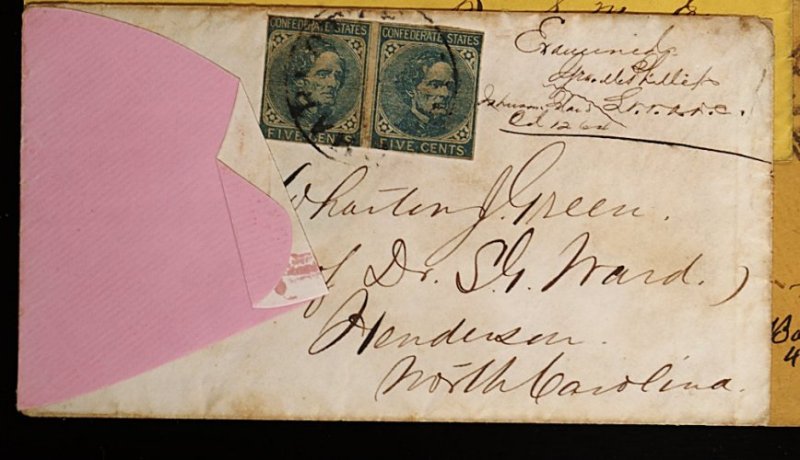1460 c 7 imageJohnson's Island O., with manuscript "Examined by _.M. Phillips/Johnsons Island/Oct 12 64" on attractive cover with pink lining addressed to Henderson, N.C., with 5c Blue, Local printing (#7) horizontal pair, ample to touching margins, tied by "Charlotte, N.C." c.d.s., cover apparently carried across the lines in another envelope or enclosure before being franked in Charlotte, side has been openned for display, trivial edge tear, very fine and unusual. (Image) Est. 500-750