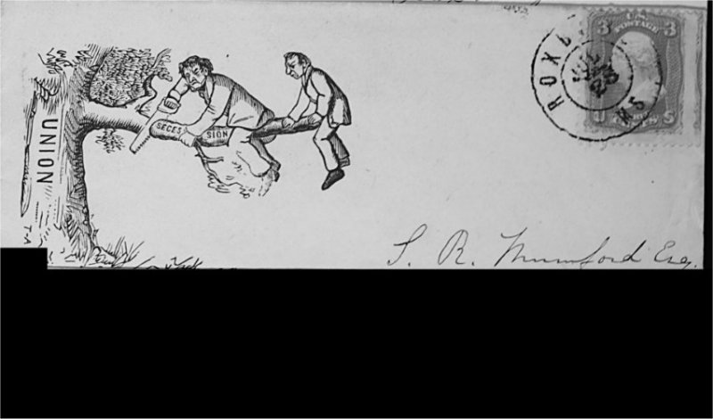 1521 c 65 image#65, 3c Rose, pretty single with natural s.e. at right showing full gutter, tied by bold "Roxbury MS/Jul 28" double ring c.d.s. to lovely blue printed "Secessionists leaving the Union." caricature Patriotic cover (Weiss C-P-S-14a), addressed to T.R. Muirford, Detriot, Michigan being a portion of the same correspondence as the previous lot, highly detailed imprint showing Southerners sawing themselves off of the "Union tree", very clean and fresh, choice very fine; a very attractive and scarce used design. (Image) Est. 200-300
