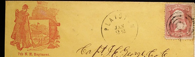 1522 c 65 image#65, 3c Rose, tied by target cancel with light "Plaistow (N.H.)/Jan 22 (1862)" c.d.s. to delightful orange 7th N.H. Regimental Patriotic cover with red design (Weiss M-F-4 var.), addressed to Capt. J.E. George, Co. C., 7th New Hampshire Reg. Vols., New York City, accompanied by four page handwritten enclosure on matching Regimental stationery, interesting contents from a son writing to his father concerning life at home, fresh and clean, a choice and very fine item which has enormous visual appeal. (Image) Est. 200-300