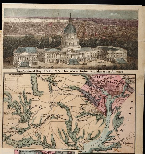 1525 imageStriking hand colored Magnus Lettersheet with historically fascinating original dated correspondence, folded and measuring 222x278mm, this document contains a multi-colored view of the U.S. Capital building, a topographical map of Virginia between Washington and Manassas Junction and a Military Map of Maryland and Virginia, Chas. Magnus publishing imprint at bottom left, the inside of the sheet contains a marvelous handwritten correspondence dated August 25, 1861 from a Union soldier who was recently transferred to the Arlington House in Arlington Heights, Virginia, from this high location overlooking the west bank of the Potomac River, his unit was in a defensive guard of the nations capital, includes a striking "doodled" salutation on the back in the form of a sketch of Arlington Heights; Arlington House, which today sits majestically above Arlington National Cemetery, is uniquely associated with the families of Washington, Custis and Lee, having been built by George Washington Custis (a grandson of Martha Washington) between 1802 and 1817, passing on to his daughter Mary Custis Lee who had married Robert E. Lee, Arlington House was the Lee's home for 30 years, being quickly evacuated in the summer of 1861 when Union occupation was imminent; some stain spots and sensible fold reinforcement, still very fine and extremely rare intact; a significant historical document not only for military content but timing as well, as it was written literally on the heals of the fleeing family of Robert E. Lee, shortly after he made his loyal but fateful decision to follow the state of Virginia into the Confederacy. (Image) Est. 300-400