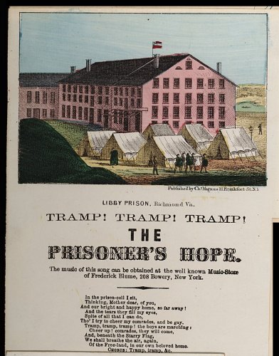 1526 imageGroup of 2 hand colored Magnus Patriotic song sheets titled "The Prisoner's Hope.", each illustrating a different Confederate prison for housing Union soldiers, one depicts Belle Island Prison Camp, the other Libby Prison, both in Richmond, Va., "In the prison cell I sit, Thinking, Mother dear, of you,..." lyrically expressing the longing of a Union soldier to be freed from prison, fresh and extremely fine. (Image) Est. 100-150