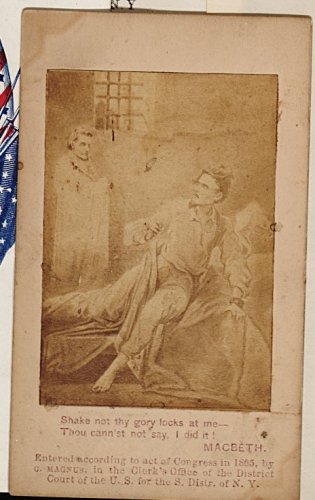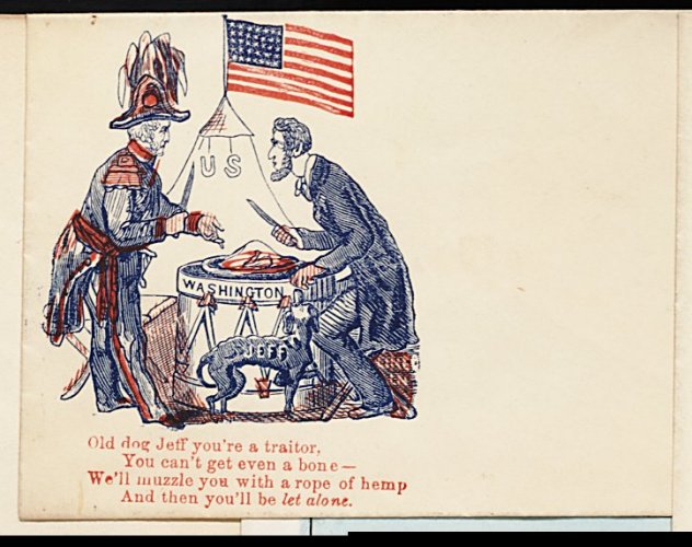1530 imageGroup of 3 Jefferson Davis caricatures on small size "photo-type" souvenir cards by Magnus, depicting the events related to the capture of CSA President Jefferson Davis in 1865, two illustrate Davis being captured (as reputed) disguised in his wife's clothing, the other shows Davis being visited by the ghost of Lincoln, light edgewear and toning as is normal for these items, very fine and quite scarce; as these are the first Davis "photo-type" cards we have ever seen. (Image) Est. 300-400