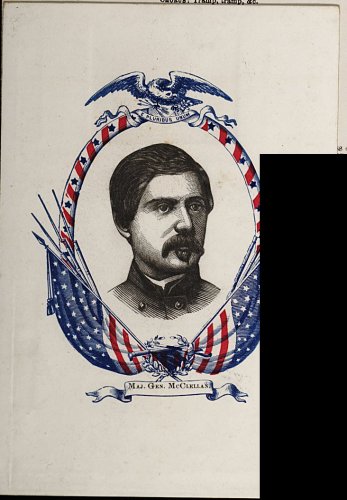 1532 c imageGroup of 8 Patriotic Union Portrait Souvenir cards, 146x100mm each, lithographed on white card stock in black, red and blue by the J.G. Wells Cor., New York, depicting Union officers, McClellan, Scott, Butler, Lyon, Wool, Banks, Corcoran and Gov. Sprague, each portrait flanked by a beautifully designed flag and eagle frame, light mounting adhesions to the reverse of each, still very fine and quite fresh; a very attractive collateral grouping. (Image) Est. 100-150