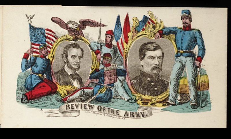 1533 c imageGroup of 4 All-Over Lincoln/McClellan Patriotic covers by Charles Magnus, all different and unused, an extremely attractive lot of the "Review of the Army" design, each fresh and bright, one hand colored, one gold and two bronze, light mounting adhesions to reverse, still very fine. (Image) Est. 100-150