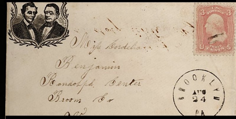 1537 c 64b image#64b, 3c Rose pink, attractive single in a vivid pastel shade, cancelled by light grid with a neat "Brooklyn Pa./Aug 24" c.d.s. at bottom right, on clean petite beardless Lincoln/Hamlin Campaign cover (Weiss FP-AL-11) addressed to Randolph Center, N.Y., trivial reduction right, still very fine; a seldom seen used design. (Image) Est. 150-200