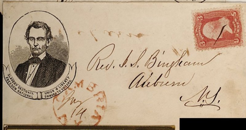 1538 c 65 image#65, 3c Rose, cancelled by pen stroke on small fresh beardless Lincoln Patriotic cover (Weiss FP-AL-44) addressed to Auburn, N.Y., pretty red "Cambria N.Y./Juy 14" c.d.s. with date in manuscript at lower left, couple of trivial edge splits to folds at sides, still very fine and highly attractive. (Image) Est. 150-200