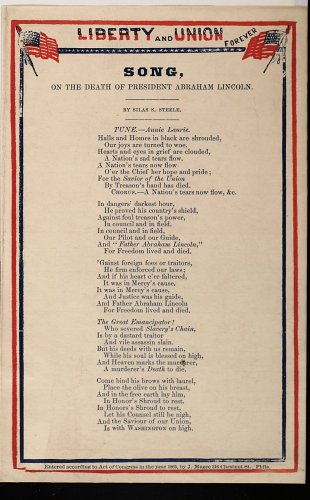1540 imageBi-colored 1865 Lincoln Mourning song sheet published by J. Magee of Philadelphia, folded to 128x198mm with blue and red printed "Liberty and Union Forever" slogan at top, title and lyrics to "Song, On The Death of Abraham Lincoln" are printed in blue, a few mounting hinges to back, still choice very fine and unusual. (Image) Est. 100-150