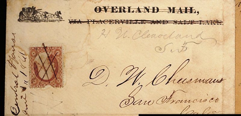 1544 c imageCentral House/June 11, 1861 manuscript town postmark on "Overland Mail/Via Placerville and Salt Lake" imprint cover (with stagecoach illustration) to San Francisco, franked with 1857 3c Dull red, Ty. II (#26; defective at top) and tied by pen strokes, "Overland Mail" imprint crossed out as envelope was used within the state, some soiling and faint water staining, nevertheless an attractive and scarce usage from a very small Butte County town. (Image) Est. 300-400