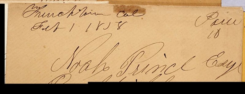 1546 c imageFrenchtown, Ca./Feb 1, 1858 manuscript postmark on buff colored cover addressed to Buckfield, Maine, with matching ms. "Paid 10" at top right, accompanied by original enclosure, cover with back flap tears which were at one time sealed with tape, small stain at top center due to tape, otherwise very fine; notation on reverse indicates "only known example", which cannot be confirmed by us, but certainly a very scarce early California small town marking. (Image) Est. 200-300