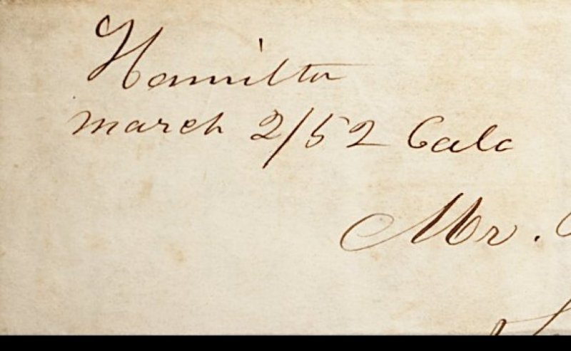 1547 c imageHamilton/March 2/52/Cala manuscript town postmark on 1852 folded letter to South Orange, Mass., with matching ms. "10" rate at top right, interesting intact enclosure datelined "Morris Ravine", some slight edge soiling, otherwise very fine; exceptionally scarce early usage from Hamilton whose post office operated from July 10, 1851 to June 26, 1865 (serving as the County seat from 1851-53). (Image) Est. 150-200