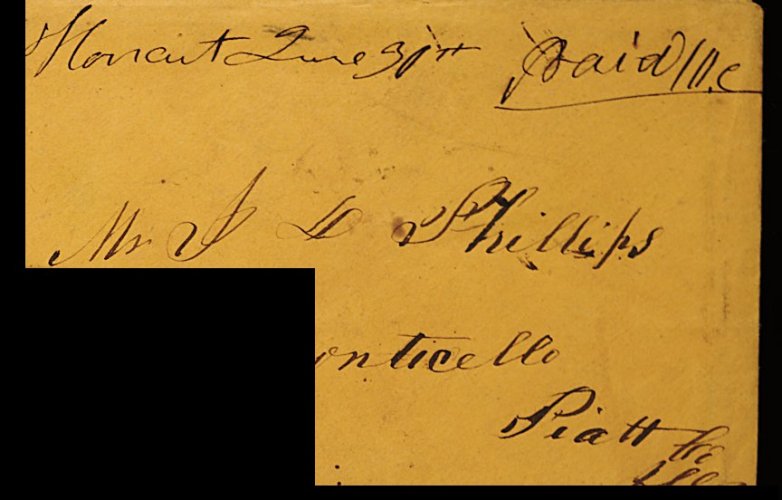 1548 c imageHoncut June 30th manuscript town postmark on orange colored cover addressed to Monticello, Piatt Co., Ill., "paid 10" in ms. alongside, accompanied by original enclosure datelined "Piatt Ranch June 16th, 1862", some minor edge wear, fine; very rare early California town marking, in fact, owner believes this may be the only known stampless cover from Honcut with original enclosure; unlisted in the American Stampless Cover Catalog. (Image) Est. 150-200