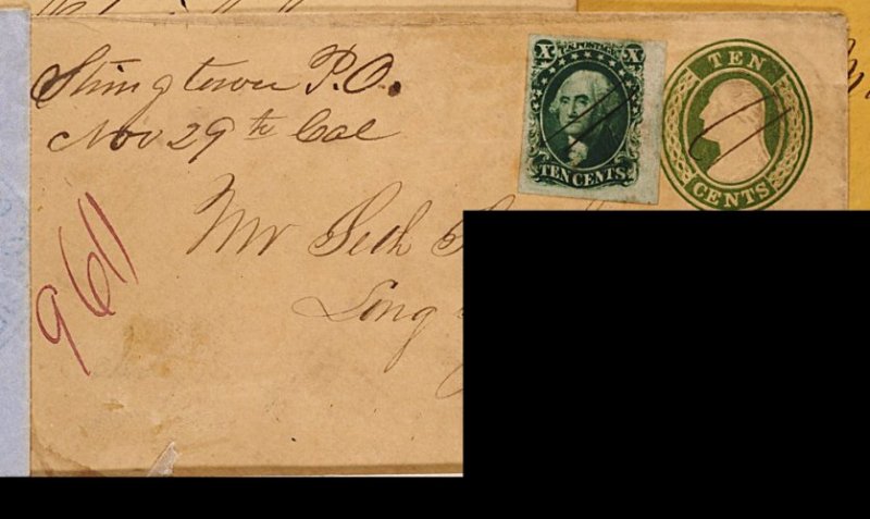 1549 c imageStringtown P.O./Nov 29th Cal manuscript town marking on 10c Pale green on buff stamped envelope (#U16a), additionally franked with exceptionally well margined 10c Green, Ty. III adhesive (#15), addressed to Baltimore, Md., stamp and indicia each cancelled with two neat pen strokes, cover with some faults including a portion of the bottom left corner replaced, still a fine and appealing usage from a very small California town in Butte County. (Image) Est. 300-400