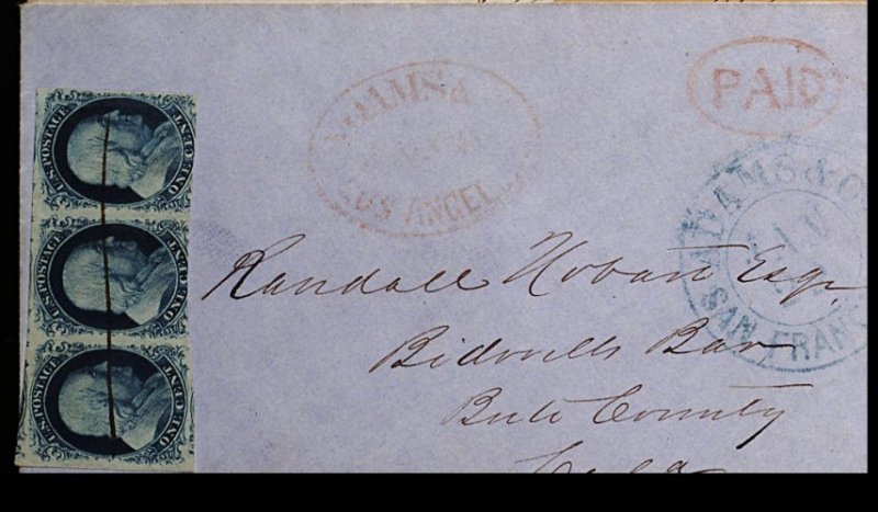 1550 c imageAdams & Co./Los Angeles red oval and matching "PAID" in oval on blue colored cover to Bidwells Bar, Ca., franked with horizontal strip of three of imperforate 1c Blue, Ty. IV (#9, large margins except just cutting at bottom), pen cancelled, with blue "Adams & Co./San Francisco" double circle handstamp, cover quite clean and attractive, very fine; ex-Haas. (Image) Est. 400-500