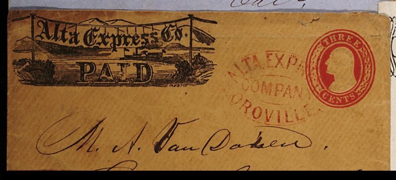 1551 c imageAlta Express/Company/Oroville clear red double oval on 3c Red on buff stamped envelope (#U10), black printed "Alta Express Co./Paid" frank at top left depicting San Francisco bridge and steamboat, addressed to San Francisco, some minor edge staining that is not terribly detracting, fine; a very scarce marking on this printed frank; ex-Haas. (Image) Est. 300-400