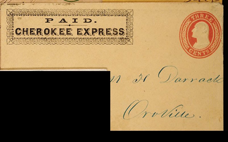 1552 c imageCherokee Express/Paid. printed frank in an elaborate rectangular box on 3c Red on buff stamped envelope (#U2), addressed to Oroville, exceptionally clean with no postal markings, very fine; one of the scarcer little known express companies that operated between Cherokee and Oroville; ex-Barkhausen. (Image) Est. 300-400