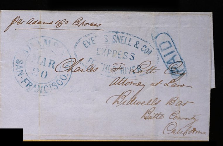 1553 c imageEverts Snell & Cos./Express/Feather River mostly clear blue strike of double oval handstamp and matching "Paid" in oval on blue folded letter to Bidwells Bar, Ca., business enclosure datelined Mar. 20, 1854 in San Francisco, mostly clear blue double ring "Adams & Co./San Francisco", couple of minor vertical file folds, still fresh and fine; very scarce and attractive double express company use; illustrated Letters of Gold and Nathan; ex-Edwards. (Image) Est. 400-500