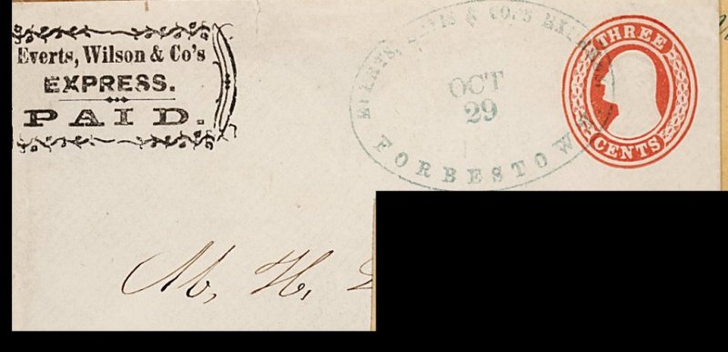 1554 c imageEverts, Wilson & Co's/Express/Paid. printed frank in fancy ornamental box, used on exceptionally clean 3c Red on white stamped envelope (#U9), postmarked by nearly complete blue oval "Everts, Davis & Co.'s Express, Forbestown (Cal)/Oct 29" datestamp, addressed to Oroville, back flap with tear, otherwise very fine and choice; ex-Edwards. (Image) Est. 400-500