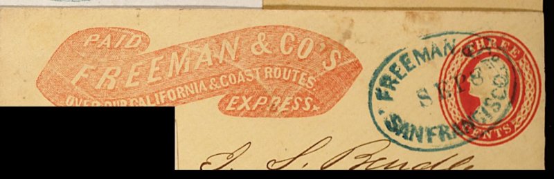 1556 c imageFreeman & Co's/Express./Paid" red printed scroll frank on 3c Red on buff stamped envelope to Bidwells Bar, choice strike of blue "Freeman & Co./Sep 8/San Francisco" oval handstamp, printed merchant's return address at bottom left, just slightly reduced at right, still quite clean and very fine. (Image) Est. 100-150