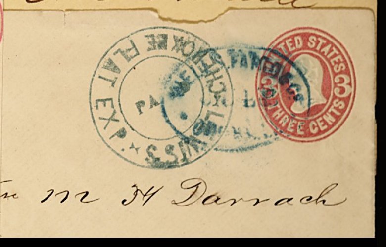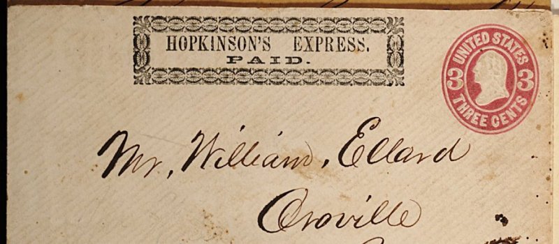 1557 c imageHopkinson's Express./Paid." printed express company frank in fancy rectangular frame on 3c Pink on white stamped envelope (#U58), addressed to Oroville, Cal., no postal markings, very minor toning and a couple of ink specks, fine; a very scarce printed frank from this short lived express service; illustrated in Letters of Gold; ex-Edwards. (Image) Est. 400-500