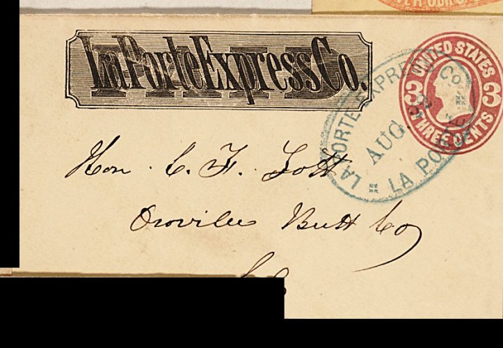 1558 c imageLa Porte Express Co./Paid printed frank in a style very similar to Wells, Fargo franks, on 3c Pink on white stamped envelope (#U58) to Oroville, Cal., choice strike of "La Porte Express Co./Aug 22/La Porte" blue oval handstamp, cover itself is quite clean, just slightly reduced at right, very fine and especially scarce properly used in this premium condition; illustrated in Wiltsee; ex-Parker and Jarrett. (Image) Est. 300-400