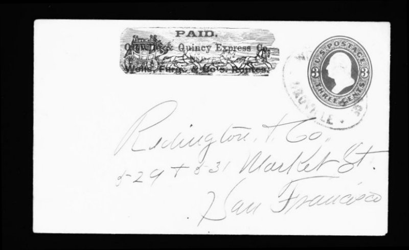 1560 c imageOroville & Quincy Express Co./and Wells, Fargo & Co.'s Routes./Paid. red and black printed frank with stagecoach illustration and letters in upper and lower case, on immaculate 3c Green on amber (#U164) stamped envelope to San Francisco, nice strike of "Wells, Fargo & Co./Oroville" blue oval handstamp cancels indicia, cover is remarkably fresh and clean, extremely fine; a superb example of this rare express company frank, whose company operated through Oroville, Quincy, Greenville, Crescent City and Taylorville only in 1874; ex-Barkhausen, Clifford, Haas and Jarrett. (Image) Est. 1,000-1,500