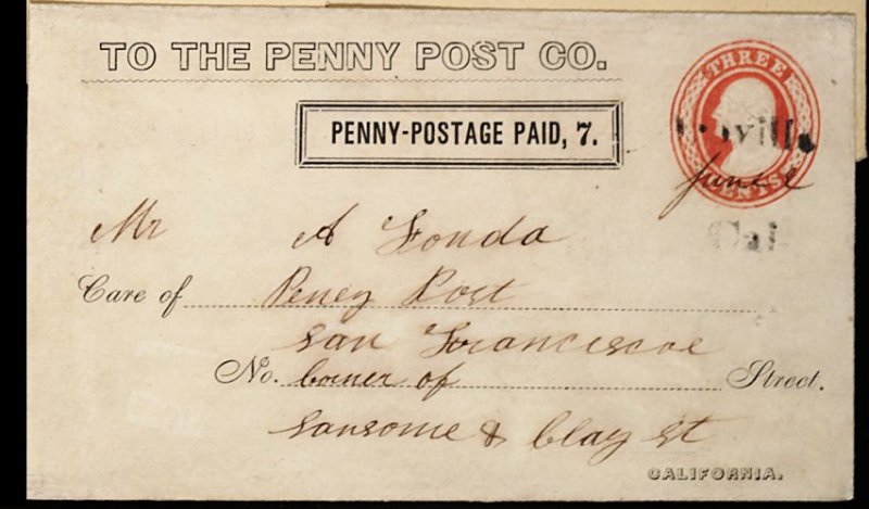 1561 c imageThe (California) Penny Post Co./Penny-Postage Paid, 7(c). printed local delivery express company frank (#34LU10a) on 3c on white stamped entire (#U9), cancelled by scarce two line "Oroville/Cal." handstamp with manuscript "June 2" date between, addressed to the Penny Post Company in San Francisco, cover just lightly and professionally cleaned, very fine; a lovely example of this rare local post entire. (Image) 1,750.00