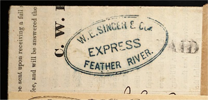1562 c imageW.E. Singer & Co.'s/Express/Feather River. superb strike of blue double oval handstamp on elaborate printed attorney's advertising form, circa 1855, which largely concerns military claims and pensions, addressed to Hamilton, Cal., clear black "Paid" handstamp of Washington, D.C. alongside, trivial edge splitting, very fine; an extraordinarily scarce express usage on a trans-continental unsealed circular; illustrated in Letters of Gold; ex-Edwards. (Image) Est. 750-1,000