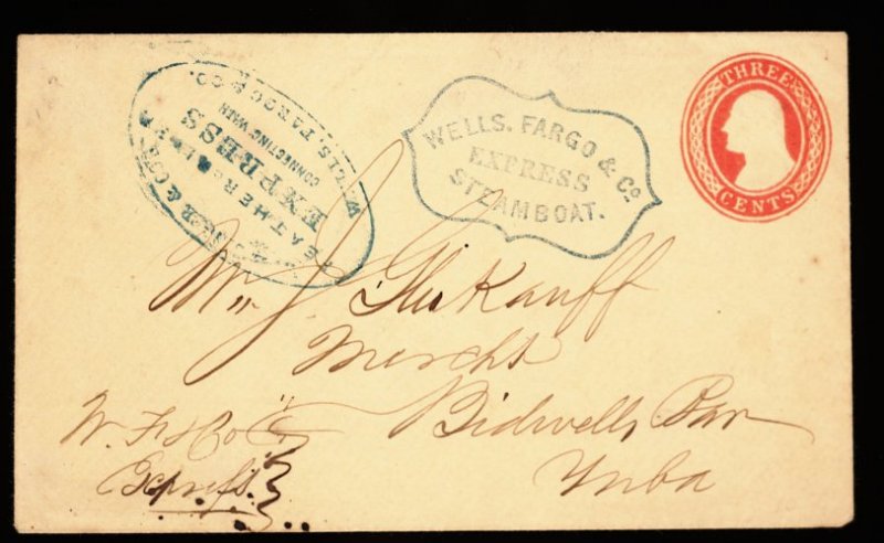 1563 c imageW.E. Singer & Co.'s/Feather River/Express/Connecting with Wells, Fargo & Co. mostly clear strike of blue oval handstamp on 3c Red on buff Nesbitt stamped envelope to Bidwells Bar, Cal., superb strike of "Wells, Fargo & Co./Express/Steamboat" shield handstamp in blue alongside, 1855 docketing on reverse, small tear through Nesbitt seal on back, very fine and exceptionally attractive; a marvelous example of the scarce steamship handstamp used on mail carried by an inland waterways steamer; ex-"Sevenoaks" Collection. (Image) Est. 1,000-1,500