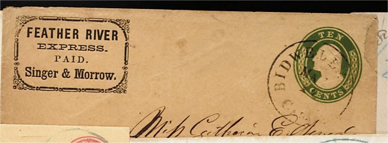 1564 c imageSinger & Morrow/Feather River/Express./Paid. larger fancy boxed printed frank on 10c Green on buff stamped envelope (#U18), addressed to Plymouth, Mass., indicia cancelled by Bidwells Bar, Cal. c.d.s., small repaired nick to right of indicia (well clear), minor edge toning, a fine example of one of the rarer express company franks; illustrated in Letters of Gold; ex-Edwards. (Image) Est. 500-750