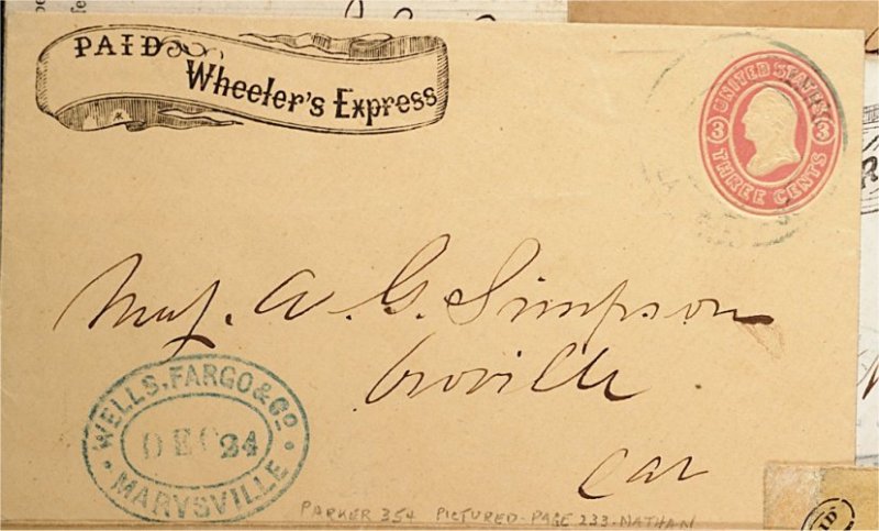 1565 c imageWheeler's Express/Paid. black printed scroll frank on 3c Pink on buff entire (#U59) to Oroville, Cal., indistinct double ring blue handstamp cancelling indicia, conjunctive usage with "Wells, Fargo & Co./Dec 24/Marysville" blue double oval handstamp at bottom left, fabulously fresh and clean, very fine and exceedingly choice; this small line operated from Marysville, Cal. to the Feather River and Gibsonville Range camps; illustrated in Nathan; ex-Parker. (Image) Est. 300-400