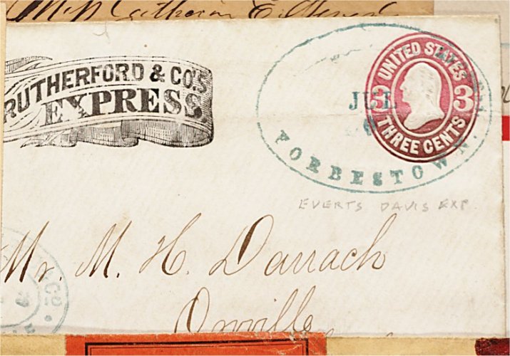1566 c imageWheeler, Rutherford & Co.'s/Express./Paid black printed ribbon frank on 3c Pink on white stamped envelope (#U58) to Oroville, Cal., with original enclosure dated July 1, 1860, largely readable blue "(Everts, Davis Express/Jul?/Forbestown" oval handstamp cancelling indicia, conjunctive usage with "Wells, Fargo & Co./Jul 2/Marysville" blue double oval handstamp at bottom left, light horizontal file fold through indicia, otherwise fine; attractive example of this very scarce express company frank. (Image) Est. 400-500