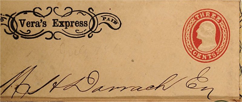1567 c imageVera's Express/Paid fancy printed express company frank on 3c Red on buff stamped envelope (#U10) to Oroville, Cal., circa 1860, wonderfully fresh and clean, cover slightly reduced at left just affecting address, otherwise extremely fine; a marvelous example of this very scarce express frank; Vera's Express was a very small line that operated only in 1857-58; ex-Jarrett. (Image) Est. 500-750