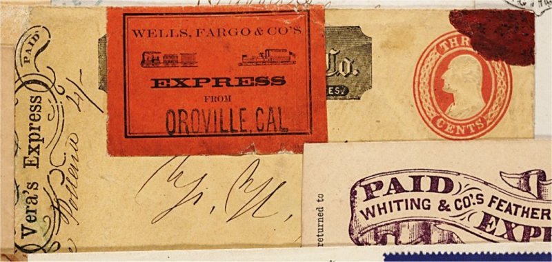 1568 c imageVera's Express/Paid fancy printed express frank, as well as "Wells, Fargo & Co./Paid" printed frank, on 3c Red on buff stamped envelope (#U10), addressed to Marysville, very scarce Wells, Fargo express label with "Oroville, Cal." handstamp has been affixed over Wells, Fargo printed frank, indicia "tied" by red wax seal, ms. "Paid Pollard 4/-" at left, the corner with indicia was once bent back and affixed to the reverse with the wax seal, the printed Vera frank was largely torn away at left, but has been professionally restored, a terribly rare and interesting conjunctive use, especially with the express label; illustrated in Nathan and Letters of Gold; ex-Clifford and Edwards. (Image) Est. 400-500
