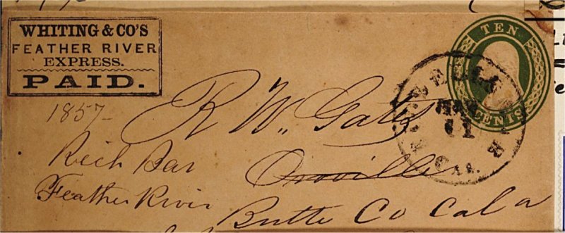 1569 c imageWhiting & Co's/Feather River/Express./Paid. printed boxed frank on 10c Green on buff stamped envelope (#U16) to Oroville, Cal., then redirected back to Feather River, Bidwells Bar, Cal. c.d.s. cancelling indicia, small repair to top right corner, otherwise fine and attractive example of this scarce frank. (Image) Est. 400-500