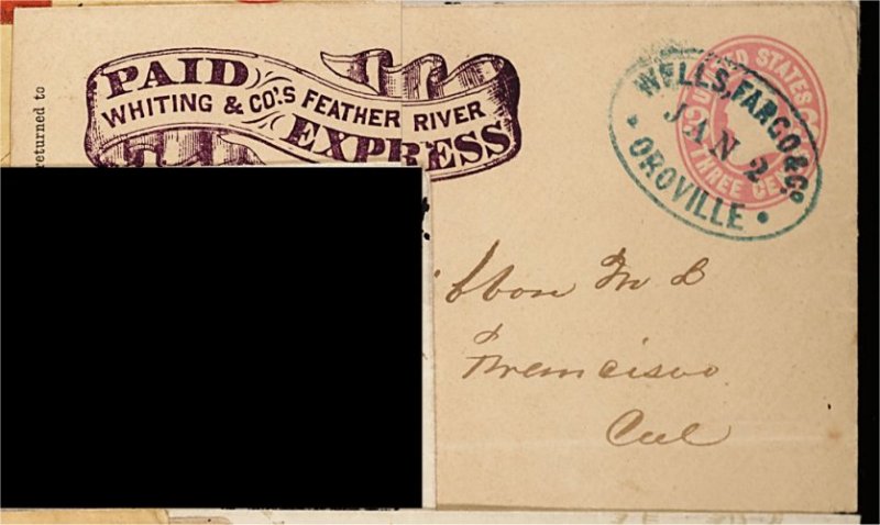 1570 c imageWhiting & Co.'s/Feather River/Express/Paid printed ribbon style frank in purple on 3c Pink on buff stamped envelope (#U59) to San Francisco, choice strike of "Wells, Fargo & Co./Jan 2/Oroville" blue oval handstamp cancel, cover has light horizontal file fold at bottom, exceptionally clean and fresh, very fine; an especially attractive example of this scarce conjunctive usage. (Image) Est. 300-400