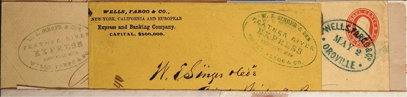1571 c imageBalance of the Western Express usages from Butte County, an interesting group of seven covers all with printed express company franks or handstamps, includes a fascinating Pacific Union Express Co. paste-up of three printed frank entires on a legal size cover from Chico to Oroville (ex-Haas), two "W.E. Singer & Co.'s/Feather River/Express" blue handstamp usages to Bidwells Bar, and four Wells, Fargo & Co. imprint covers, various usages, including a most attractive paste-up usage with an unused Civil War patriotic cover, Chico to Oroville (PF certificate), some usual small faults, overall a fine and attractive group. (Image) Est. 500-750