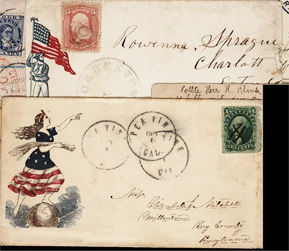 1572 c imageCivil War patriotic covers from California towns, two very scarce multicolored patriotic covers being the only known such usages from Forbestown and Pea Vine., the former franked with 3c Rose (#65) and features sailor with flag design (Walcott unlisted) and is accompanied by original patriotic design lettersheet, the latter franked with scarce 10c Green, Ty. V (#35; faults at right) and depicts a flag draped figure holding wheat on a globe (Walcott #2312), each cover with some edge faults, still a fine and attractive pair. (Image) Est. 300-400